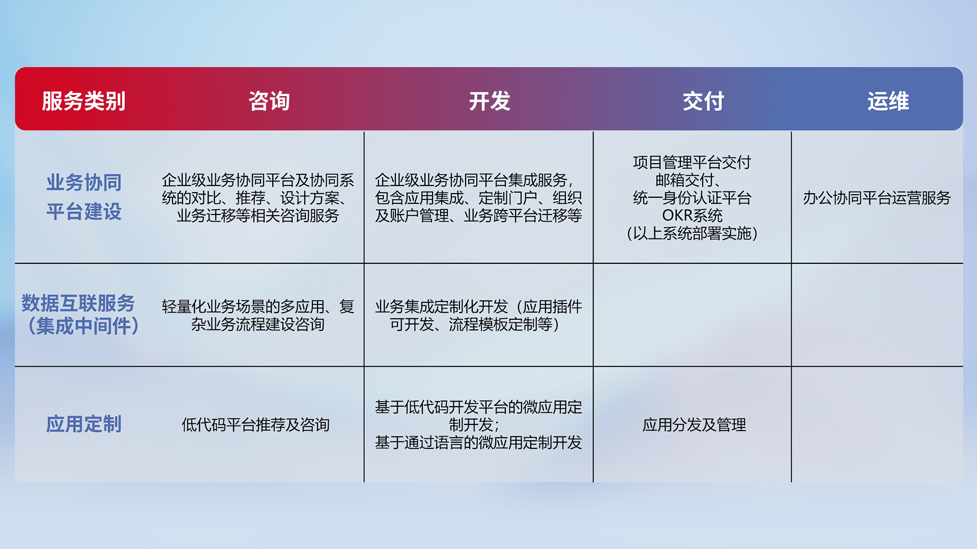 针对钉钉、、、企微、、IDaas等平台级产品提供产品的规划、、方案、、交付、、、定制化开发等服务,,实现如统一协同办公、、智能客户服务、、混合会议管理、、、智能数据查询、、、、等业务场景,,,实现数字化转型。。